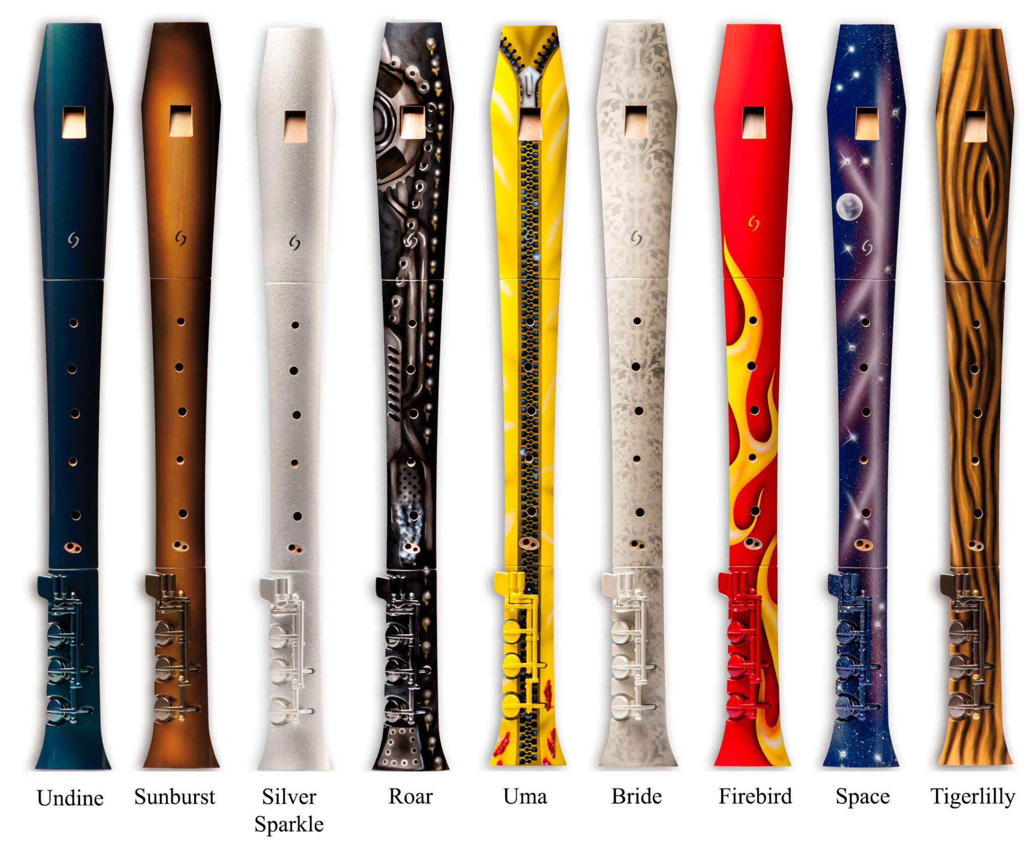 A new kind of recorder based on Mollenhauer’s Modern Alto recorder with cool designs, powerful tone and an electric pick-up. Each design is hand painted, airbrushed and gloss varnished over pearwood. Each recorder has a footjoint with -E- extension and triple key for E-F-F#.