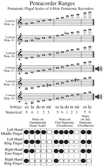A Pentacorder is the easiest wind instrument to learn for people of any age. No thumb-hole is needed. Play two octaves with only two fingers of each hand! There is no other flute-instrument capable of doing that. Two-part models can be pitch-adjusted by moving joints slightly in or out.